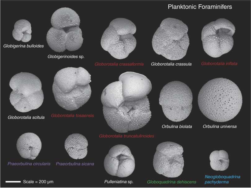 Figure F14. Selected planktonic foraminifer species found during Expedition 307. Red = Pliocene–Holocene species, purple = middle Miocene species, green = Miocene species, blue = cold-water species.