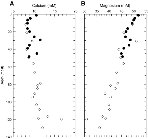 Figure F24. Concentrations vs. depth. A. Calcium. B. Magnesium. Solid circles = Hole U1316A, open diamonds = Hole U1316B.