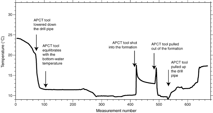 Figure F31. Example temperature data profile collected during deployment of advanced piston corer temperature (APCT) in situ temperature tool.
