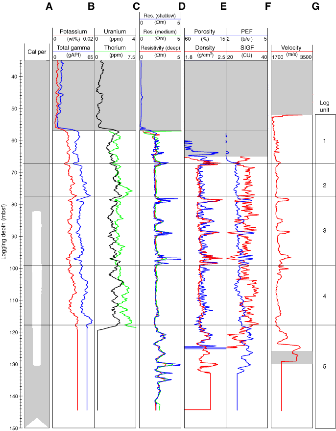 Figure F36. Log stratigraphy. A. Hole shape, total spectral gamma radiation, and potassium content. B. Thorium and uranium. C. Deep, intermediate, and shallow resistivities. D. Porosity and formation density. E. Capture cross-section (SIGF) and photoelectric effect factor (PEF). F. Downhole compressional velocities. G. Logging units.
