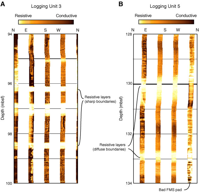 Figure F38. Example of bedding characterization for Formation Microscanner (FMS) images of depth intervals 92–102, 112–122, and 125–135 mbsf. Resistive zones are in light yellow. Conductive zones are in dark brown. Many of the highly resistive layers are characterized by a bedding dipping to the southeast.