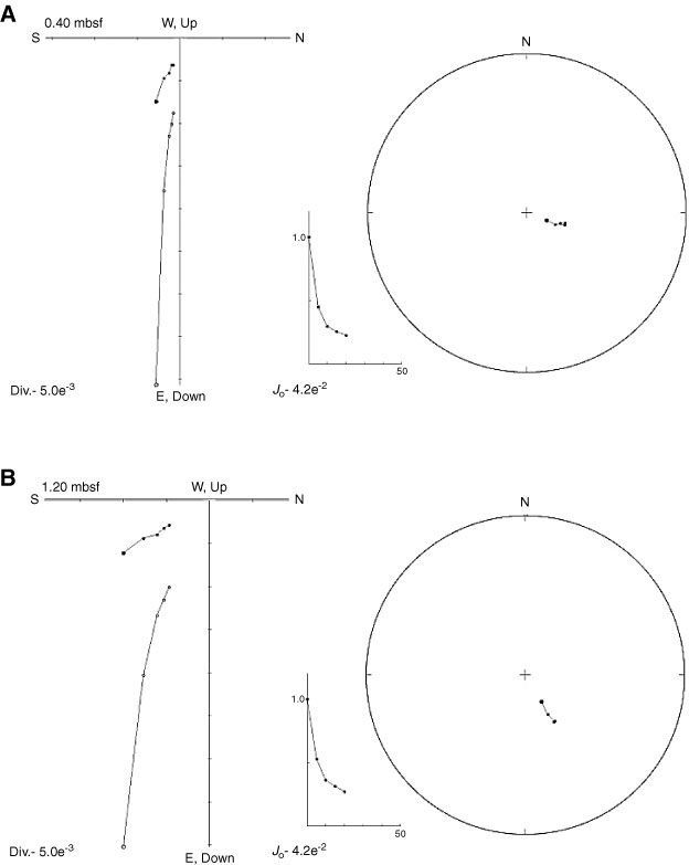 Figure F12. Stepwise AF demagnetization (5, 10, 15, and 20 mT) of Section 307-U1317A-1H-1 at (A) 0.40 mbsf and (B) 1.20 mbsf. Left panels represent orthogonal projection of endpoints of the magnetization vector. Open symbols = projection on vertical plane, solid symbols = projection on horizontal plane. Middle panels represent change in magnetization intensity during AF demagnetization. Right panels represent equal area projection of the magnetization vector during demagnetization.