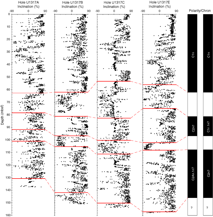 Figure F13. Inclination of magnetization vector vs. depth in Holes U1317A, U1317B, U1317C, and U1317E after AF demagnetization at peak fields of 15 mT and two magnetostratigraphic interpretations.