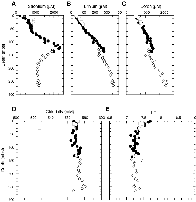 Figure F16. Concentrations of the dissolved chemical species vs. depth. A. Strontium. B. Lithium. C. Boron. D. Chlorinity (by titration). E. pH. Solid circles = Hole U1317A, open diamonds = Hole U1317D, open squares = Hole U1317E.
