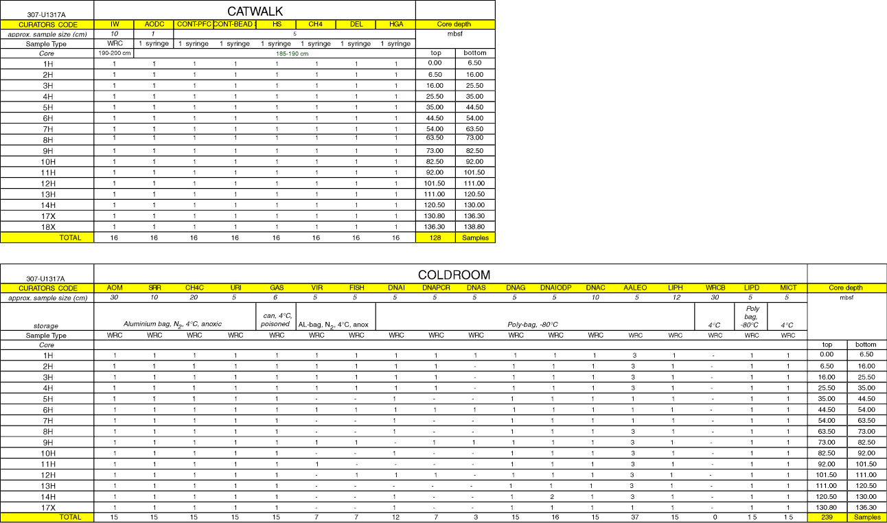 Figure F19. Graphic representation of subsampling and analysis program for the MBIO core sections from Hole U1317A. The sequence of subsections runs from the top of the core (right) toward the bottom (left). See Table T4 in the "Methods" chapter for explanation of sampling codes.