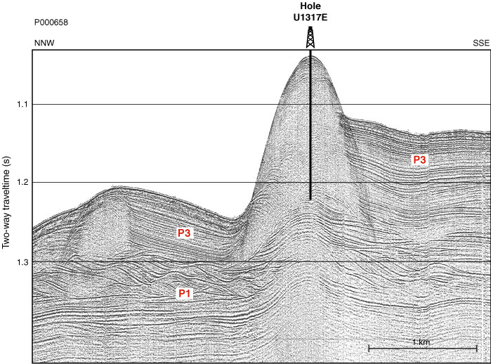 Figure F2. Downslope seismic section of Challenger Mound and Site U1317.