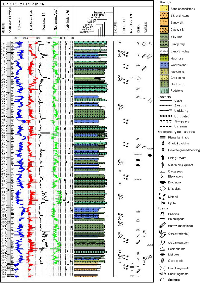 Figure F3. Sedimentological log of the Pleistocene mound succession (lithostratigraphic Unit 1) in Hole U1317A. In this hole, the mound base is identified at 130.1 mbsf.