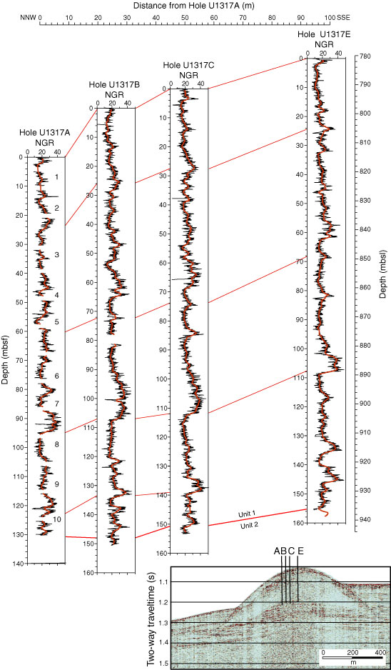 Figure F30. Natural gamma radiation (NGR) depth curves. Numbers next to the Hole U1317A NGR data are a preliminary and informal numbering of stratigraphic cycles.