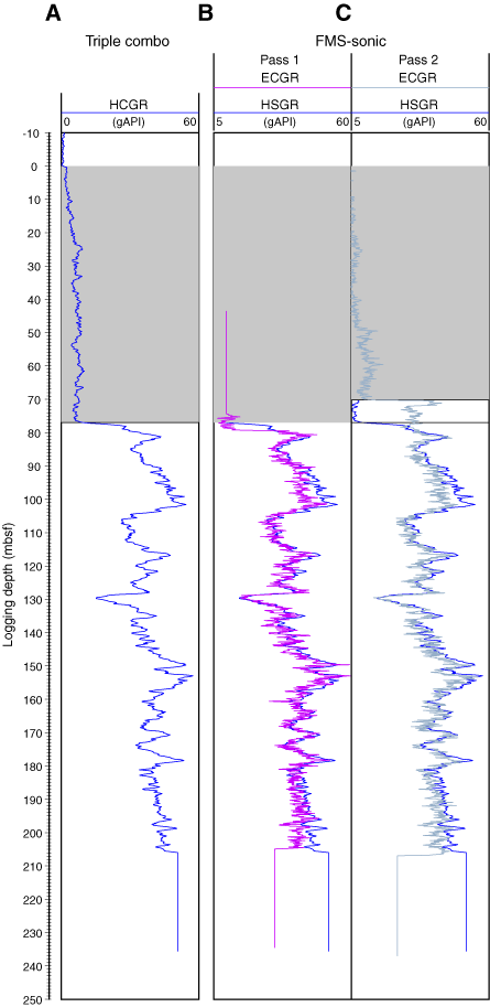 Figure F33. Depth-shifting. A. Triple combination (triple combo) tool string total gamma ray log (HSGR) used as reference for depth-shifting. B. Formation MicroScanner (FMS)-sonic tool string gamma ray log (ECGR) in respect to HSGR for Pass 1. C. The FMS-sonic tool string ECGR in respect to HSGR for Pass 2.