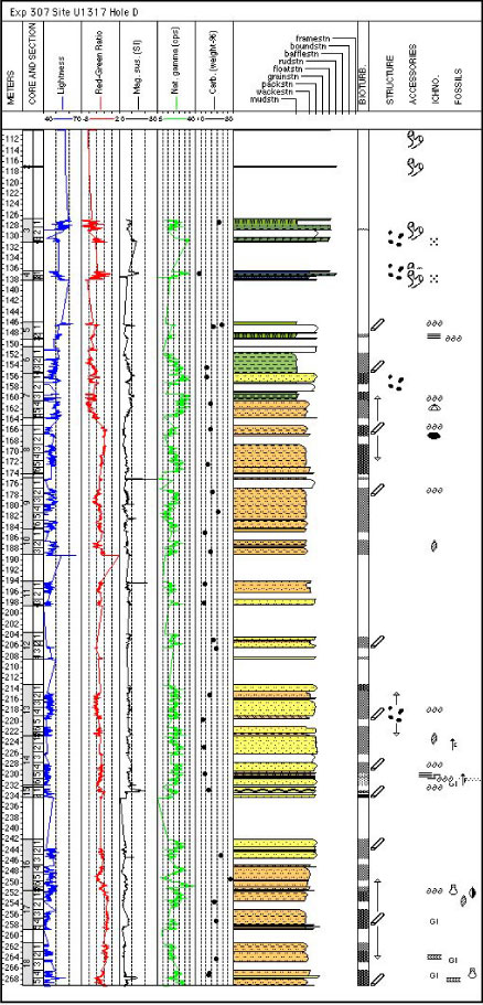Figure F4. Sedimentological log of the Miocene drift successions (lithostratigraphic Unit 2) in Hole U1317D. The boundary between the siltstone facies and the sandstone facies is at 197 mbsf. See Figure F3 for symbol legend.