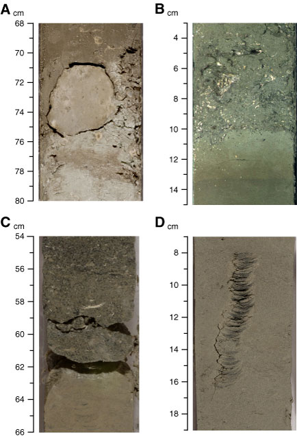 Figure F7. A. Coral floatstone abruptly changing into calcareous sandy clay including a large dropstone (interval 307-U1317C-2H-3, 68–80 cm). B. Boundary between the Pleistocene mound succession (lithostratigraphic Unit 1) and the Pliocene and Miocene drift succession of lithostratigraphic Unit 2 (interval 307-U1317A-7H-1, 3–15 cm). C. Erosional boundary within Miocene drift succession (interval 307-U1317D-15R-1, 54–66 cm). D. Silty fine sand of the Miocene drift succession with burrow (interval 307-U1317D-12R-2, 7–19 cm).