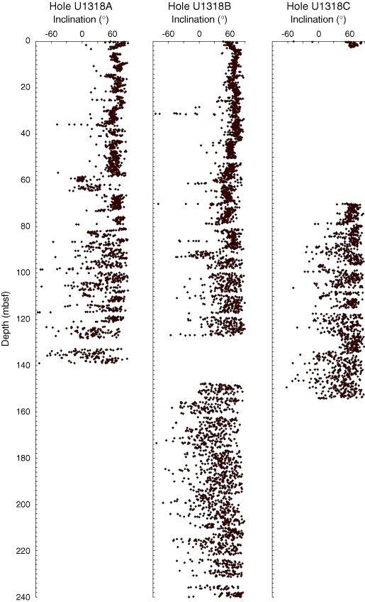 Figure F11. Inclination of the magnetization vector vs. depth in Holes U1318A, U1318B, and U1318C after AF demagnetization at peak fields of 15 mT.