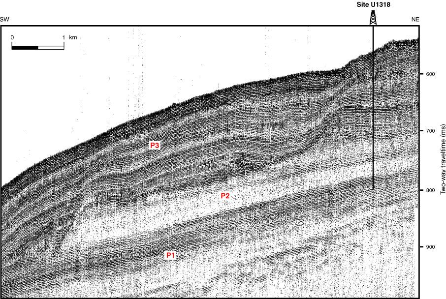 Figure F2. Downslope seismic section and seismic Units P1–P3 along the upper continental slope east of the Belgica mound province.