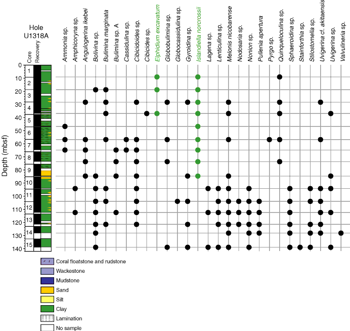 Figure F8. Occurrence of benthic foraminifers from core catcher of each core in Hole U1318A. Assemblages in lithostratigraphic Unit 1 are low in diversity and dominated by shallow-water species.