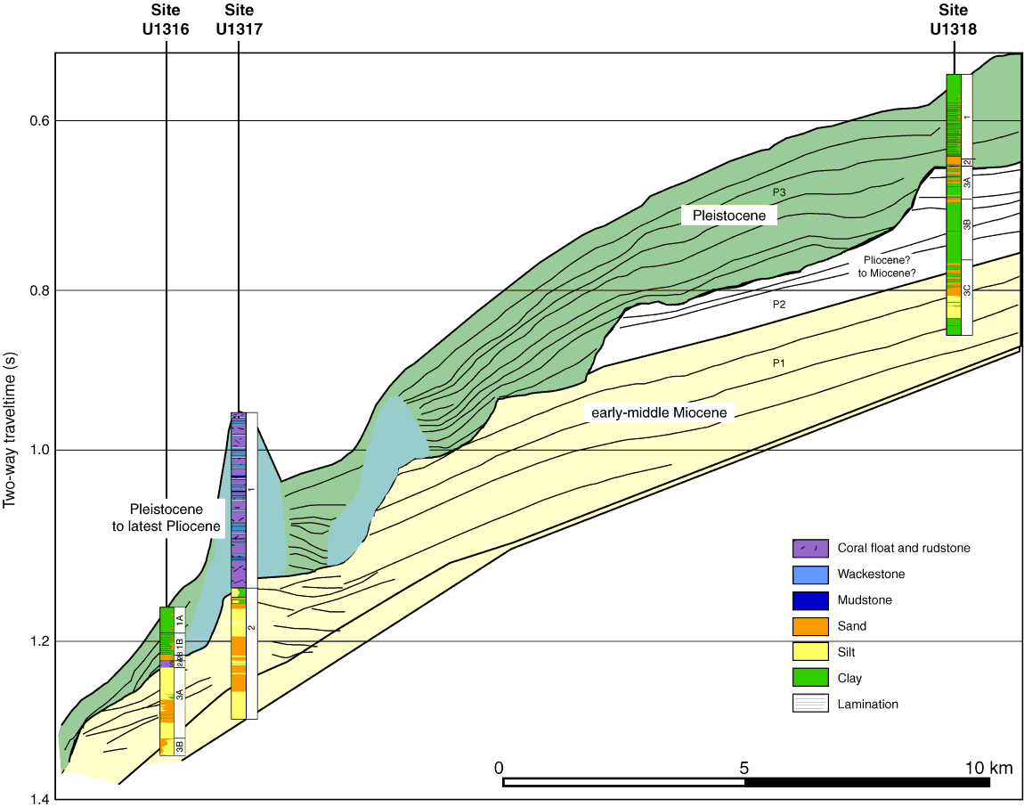 Figure F9. Lithostratigraphy of all three sites projected on the seismic profile of Challenger Mound along a north–northwest to south–southeast transect. P1–P3 refers to seismic units as defined by Van Rooij et al. (2003).