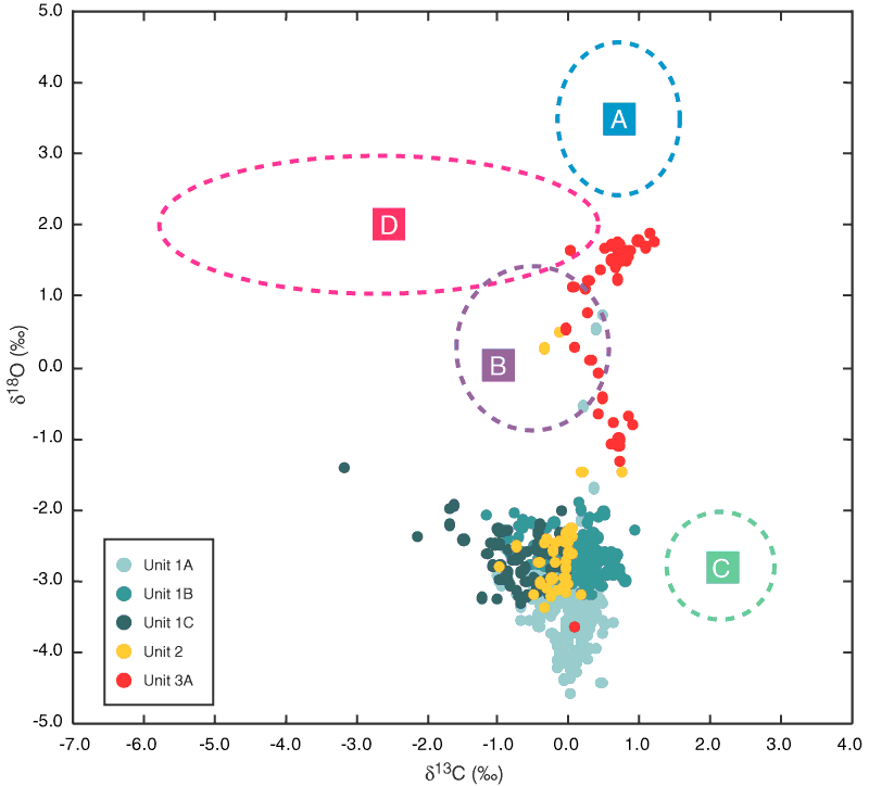 Figure F2. Cross-plot of carbon and oxygen values, Hole U1318B. For comparison, the isotopic range of potential sources (A–C) and bulk mound sediments from Hole U1317E (D) (Takashima et al., 2006) are also shown. A = benthic foraminifer Cibicidoides sp. from ODP Site 982, B = planktonic foraminifer Globigerina bulloides from Hole U1317E (Sakai et al., 2009), C = Cretaceous chalk from southeast England (Jenkyns et al., 1994).