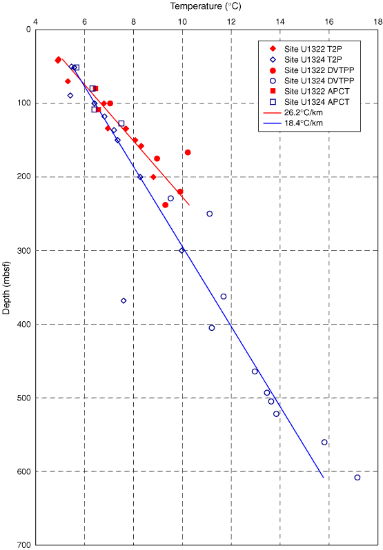 Figure F45. Temperature data for Sites U1322 and U1324. Advanced piston corer temperature (APCT) tool data are corrected to predict the in situ temperature whereas Davis-Villinger Temperature-Pressure Probe (DVTPP) and temperature/dual pressure (T2P) probe data are not corrected. The average gradient at Site U1324 is 18.4°C/km, whereas at Site U1322 the average gradient is 26.2°C/km.