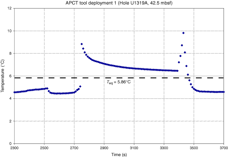 Figure F44. Time series data for advanced piston corer temperature (APCT) tool deployment at 42.5 mbsf (above Core 308-U1319A-5H). Equilibrium temperature is interpreted to be 5.86°C. Temperature spikes caused by friction are measured during insertion into the sediment and removal from the sediment. Data are available in “Downhole” in “Supplementary material.”