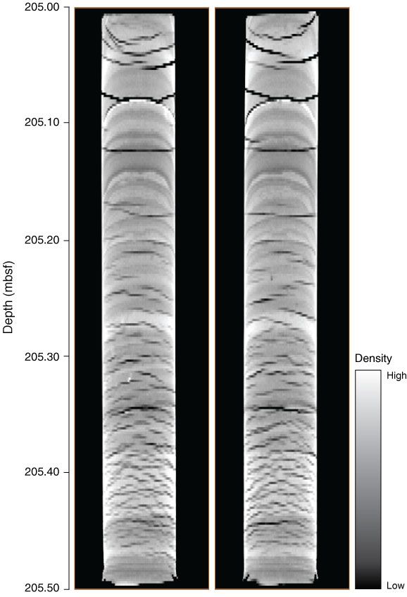 Figure F7. Positive X-ray CT scan from Ursa Basin, Site U1324 (Sample 308-U1324C-4H-4, 50–100 cm). CT image was completed by CQI. Dark colors = low densities and are interpreted as voids, light colors = higher densities typical of sediment.