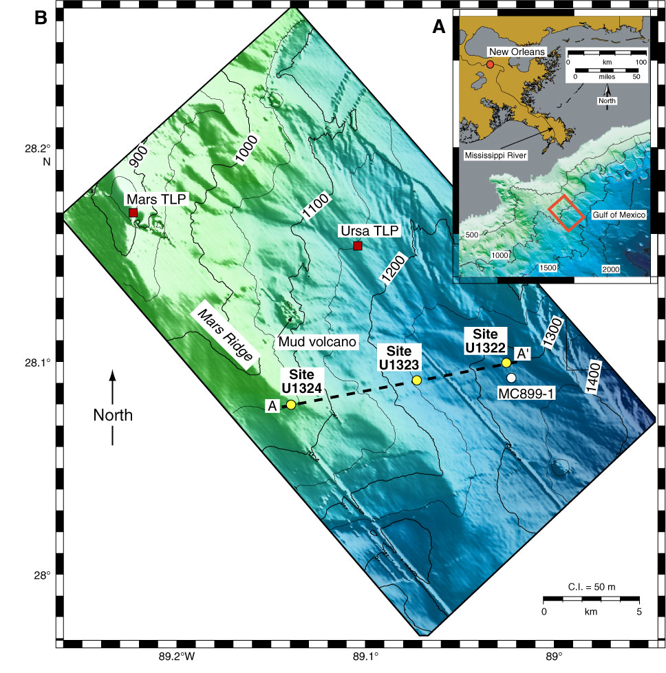 Figure F1. A. Bathymetry image showing the Ursa region 210 km southeast of New Orleans, Louisiana (USA). B. IODP drilling transect located in 1000–1300 m water depth. Expedition 308 sites are shown with yellow circles. The Ursa and Mars oil fields are overlain by the Ursa and Mars tension-leg platforms (TLP; squares). Industry well MC 899-1 is shown with a white circle. CI = contour interval.