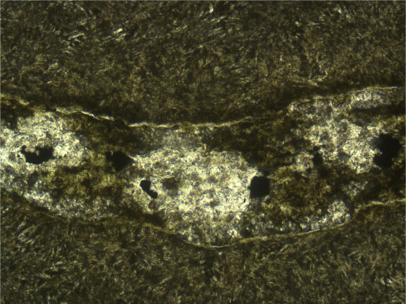 Figure F112. Vein of chlorite-smectite, quartz, pyrite, titanite, and calcite (Thin Section 91; Sample 309-1256D-128R-1, 65–70 cm) (field of view = 2.5 mm; plane-polarized light).
