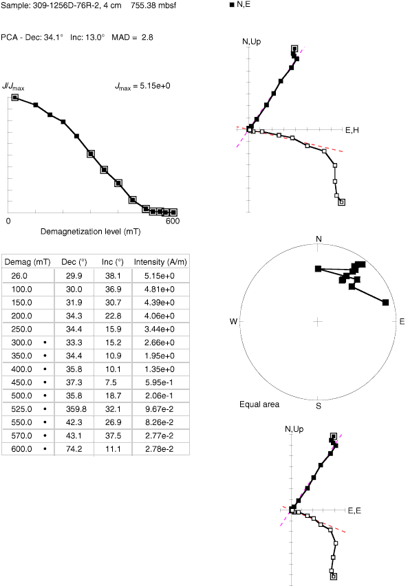 Figure F172. Thermal demagnetization (demag) behavior of a well-behaved 1 cm3 sample. Drilling overprint is only moderate on NRM. Stable directions for 350°–500°C and steady intensity decrease suggest the magnetic carrier is primarily Ti-poor titanomagnetite. Dec = declination, Inc = inclination. MAD = maximum angular deviation.