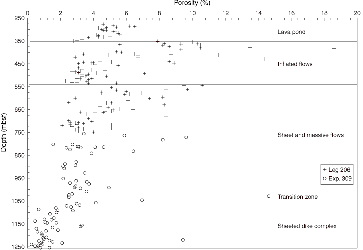 Figure F182. Variation in porosity with depth in Hole 1256D.