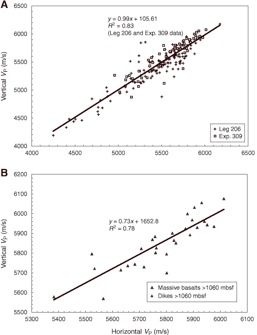 Figure F185. Seismic anisotropy. A. Horizontal and vertical VP of Leg 206 and Expedition 309. B. Horizontal and vertical VP of sheeted dike discrete samples (1060–1255 mbsf).