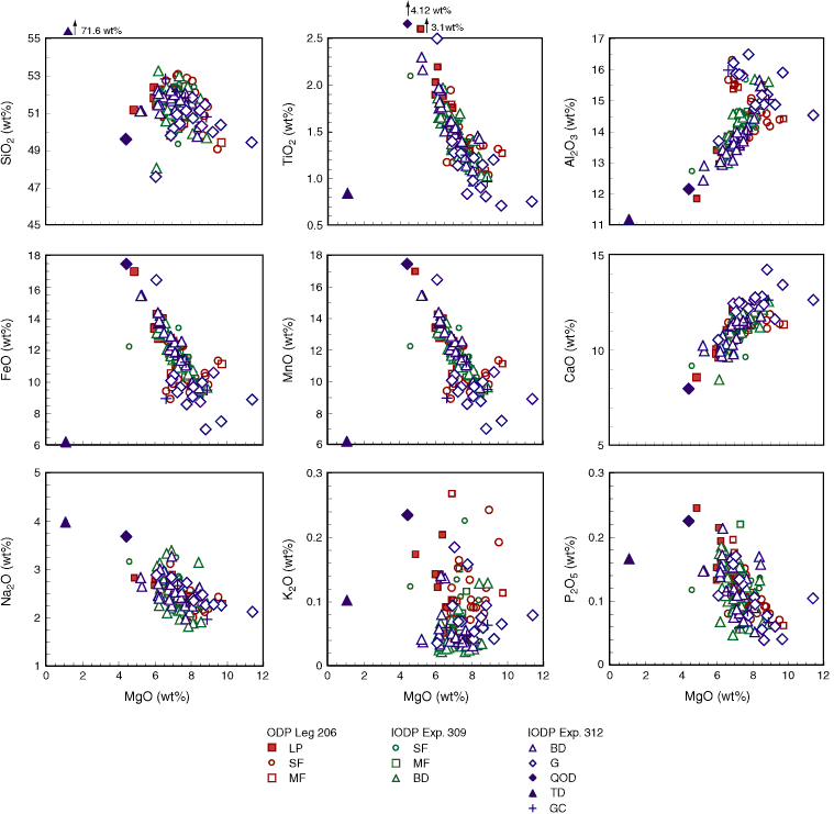 Figure F253. Variation in major and trace elements with MgO contents in Hole 1256D rocks. LP = lava pond, SF = basalt sheet flow, MF = basalt massive flow, BD = basaltic dike, G = gabbro, QOD = quartz-oxide diorite, TD = trondhjemite dike, GC = ghost core. See “Geochemistry” in “Expedition 309” for the samples labeled 309 and “Geochemistry” in “Expedition 312” for Expedition 312 analyses. Northern East Pacific Rise data from C.H. Langmuir (unpubl. data, www.petdb.org, 1999). Site 504 data from Autio et al. (1983), Natland et al. (1983), Emmermann (1985), and Tual et al. (1985). (Continued on next page.)