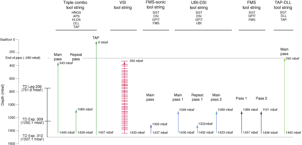 Figure F341. Logging operations at Site 1256D during Expedition 312. HNGS = Hostile Environmental Gamma Ray Sonde, APS = Accelerator Porosity Sonde, HLDS = Hostile Environment Litho-Density Sonde, DLL = Dual Laterolog, TAP = Temperature/Acceleration/Pressure tool, VSI = Versatile Seismic Imager, SGT = Scintillation Gamma Ray Tool, DSI = Dipole Sonic Imager, GPIT = General Purpose Inclinometer Tool, FMS = Formation MicroScanner, UBI = Ultra Sonic Borehole Imager. TD = total depth.