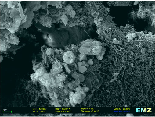 Figure F17. Surface of blue biofilm covered with a network of desiccated exopolymeric substances, minerals, probably carbonates, and microorganisms (Hole M0015B; 0.47 mbsf; glutaraldehyde fixed SEM at 19,200×).