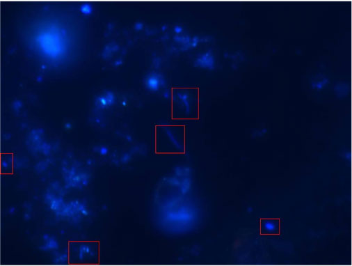Figure F19. Rather high diversity of cell morphologies. Cells were common in this sample (Hole M0007C; 5.88 mbsf; DAPI-stained fluorescence microscopy).