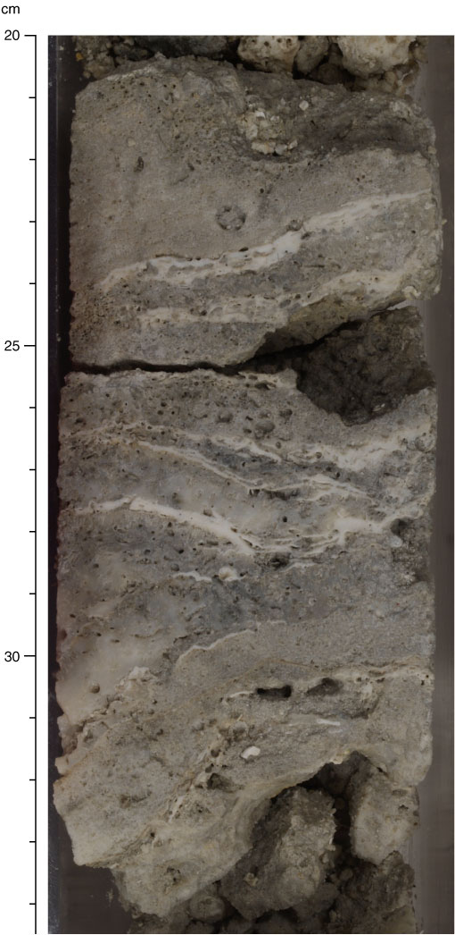 Figure F14. Encrusting colonies of Montipora and Pavona interlayered with coralline algal crusts (Subunit IA; interval 310-M0007A-6R-1, 20–34 cm).
