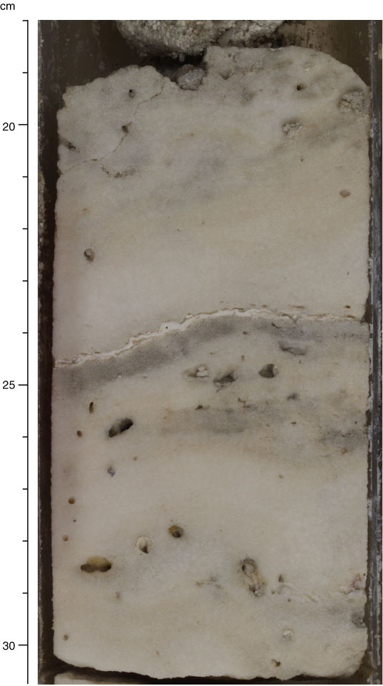 Figure F20. Massive colony of Porites with a thin crust of coralline algae between 24 and 25 cm (Subunit IA; interval 310-M0007A-7R-1, 18–30 cm).