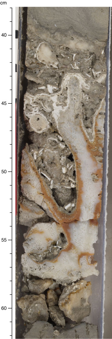 Figure F24. Tips of robust branching colonies of Pocillopora encrusted with coralline algal crusts (Subunit IB; interval 310-M0005C-8R-1, 38–62 cm). Coarse skeletal sand fills primary voids.