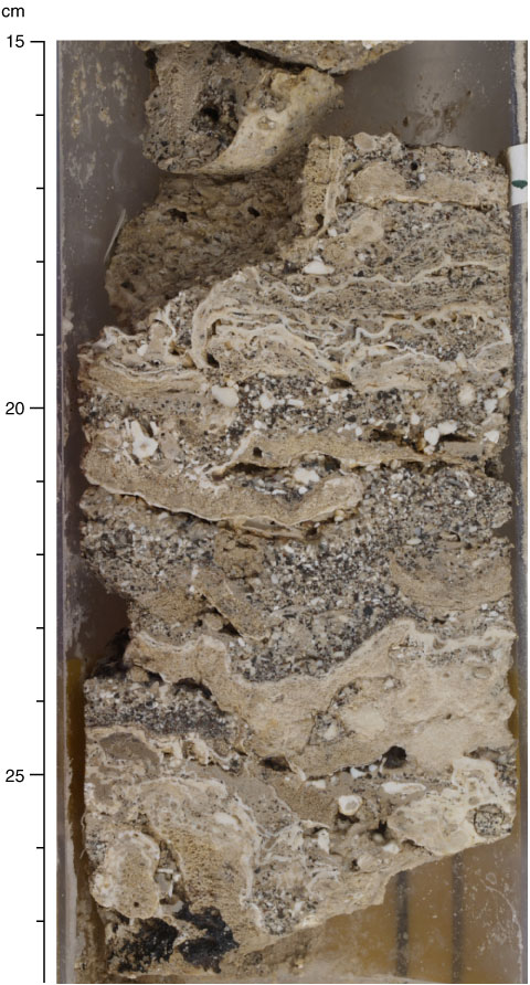 Figure F55. Coralgal frameworks composed of encrusting colonies of Porites and tabular colonies of Acropora(?) interbedded with grainstone rich in volcanic grains and skeletal fragments (Subunit IIG; interval 310-M0005D-32R-3, 15–27 cm).