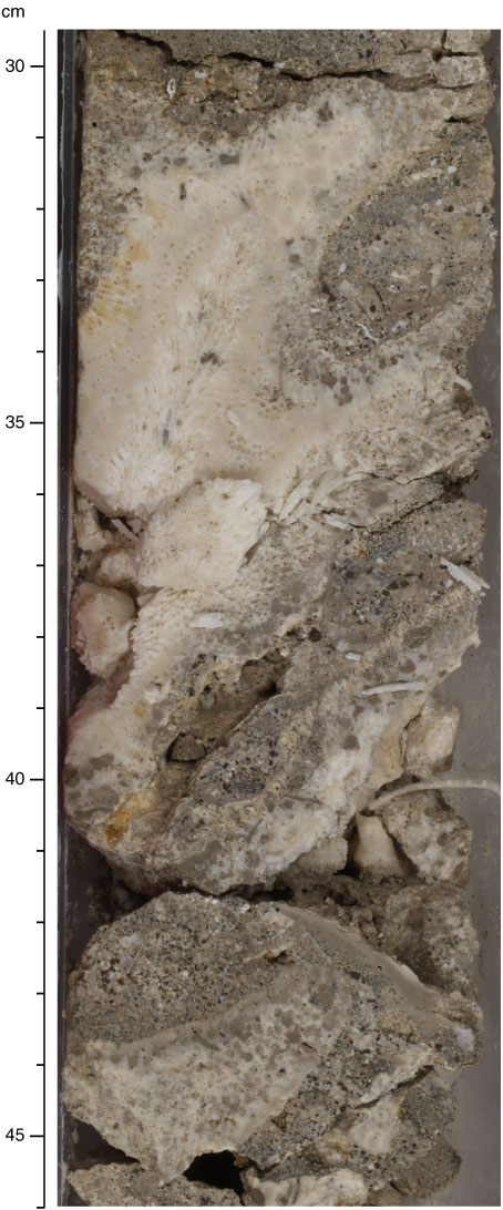 Figure F58. Robust branching colony of Pocillopora (Subunit IIG; interval 310-M0005D-30R-2, 30–46 cm). Note strong bioerosion of corals.