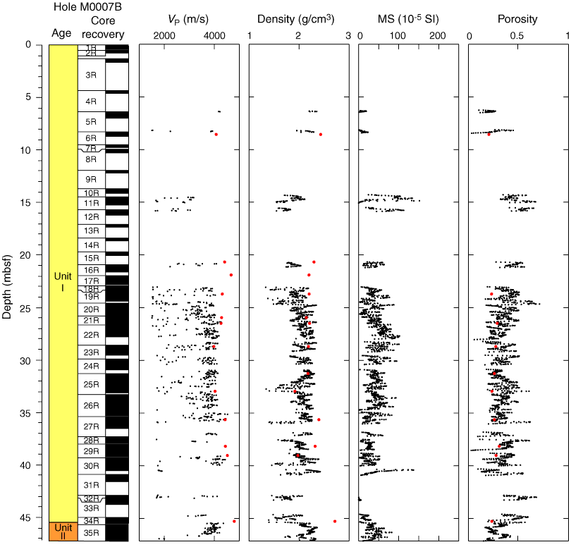Figure F66. Velocity, bulk density, magnetic susceptibility, and porosity as a function of depth in Hole M0007B. Discrete measurements are superimposed (red circles).