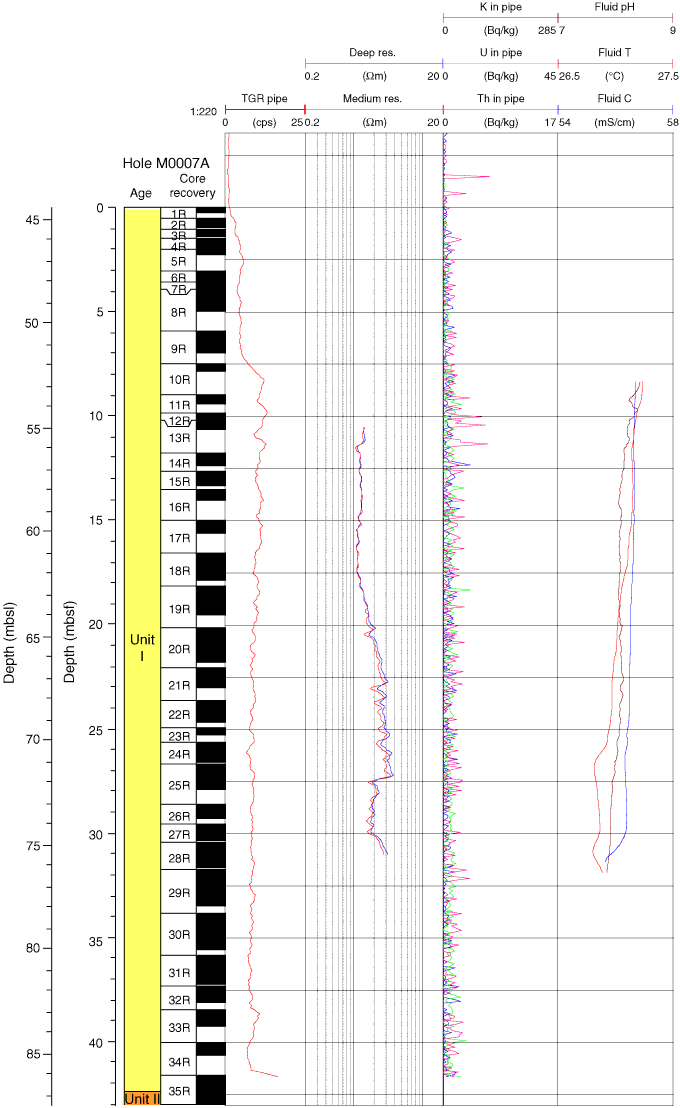 Figure F76. Wireline logging data, Hole M0007A. TGR = total gamma radiation, res. = resistivity, T = borehole fluid temperature, C = borehole fluid conductivity.