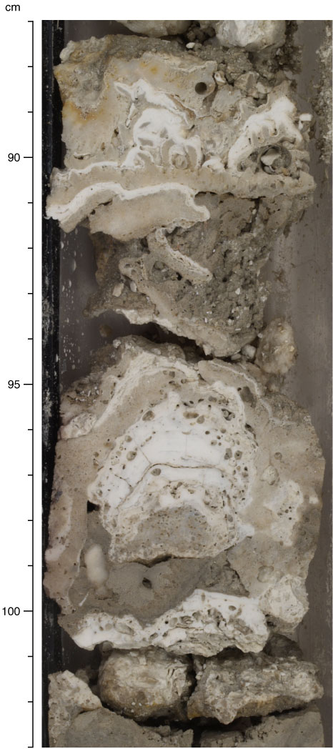Figure F21. Interlayered encrusting corals (Lepastrea, agariciids, Porites, and Montipora) (Subunit 1B; interval 310-M0017A-14R-1, 87–103 cm).