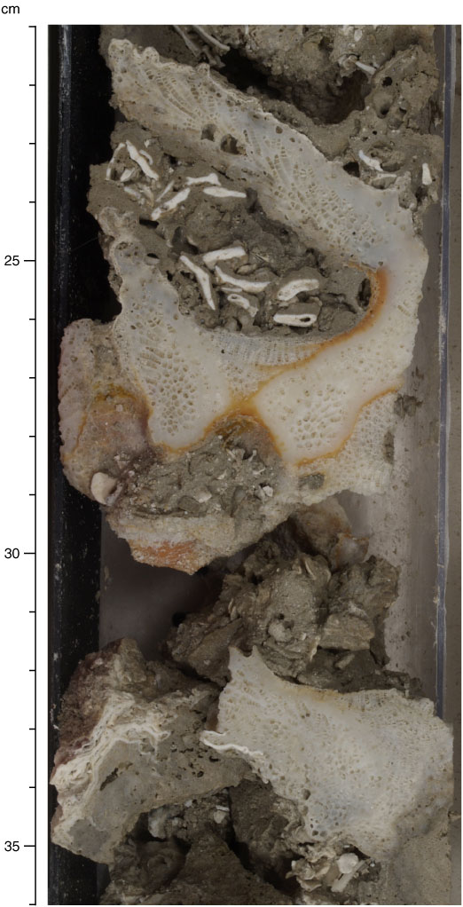 Figure F23. Robust branching Pocillopora framework with Halimeda-bearing sediment in primary vugs (Subunit 1B; interval 310-M0017A-13R-1, 21–36 cm).