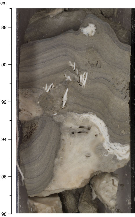 Figure F25. Thick laminated microbialite crusts on top of algal-covered coral (Subunit 1B; interval 310-M0017A-16R-1, 87–98 cm). Note Halimeda segments engulfed in the microbialites.