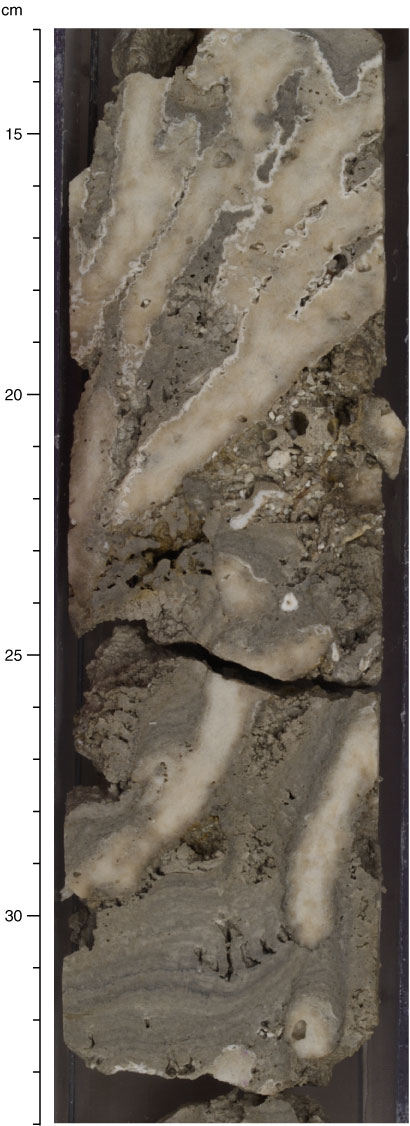Figure F30. Coral framework composed of branching Porites associated with thin encrusting coralline algae and laminated to thrombolitic microbialite crusts (Subunit IC; interval 310-M0015B-34R-1, 13–34 cm).