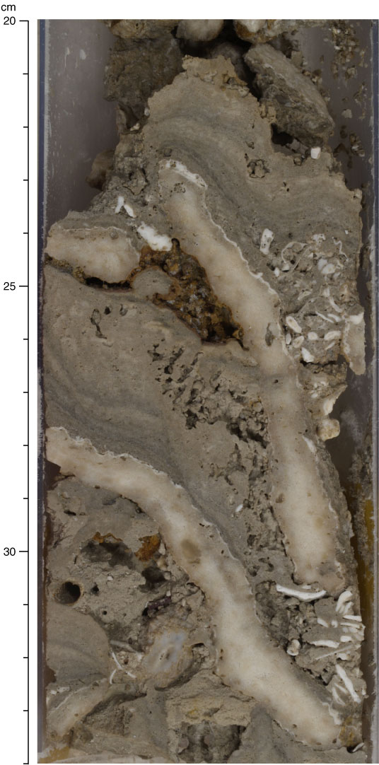 Figure F31. Coral framework of branching Porites encrusted with thin coralline algal crusts and laminated to thrombolitic microbialites (Subunit IC; interval 310-M0016B-11R-1, 20–34 cm). Primary vugs are partly filled with sediment, including Halimeda segments.