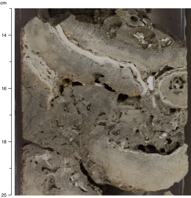 Figure F36. Coral assemblage dominated by encrusting Leptastrea with tabular Acropora covered with coralline algal crusts and subsequent microbialite crusts (Subunit IA; interval 310-M0016A-22R-1, 13–20 cm).