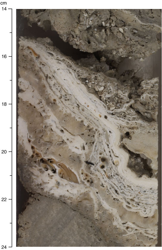 Figure F39. Coralgal bindstone with interlayered encrusting colonies of Pavona and coralline algae (Subunit IC; interval 310-M0016A-30R-1, 14–24 cm).