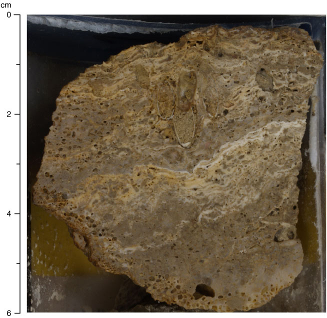 Figure F4. Abundant thin coralline algal crusts at the top of the subunit are extensively bioeroded (Subunit IA; interval 310-M0018A-1R-1, 0–6 cm). Note shells of boring bivalves.