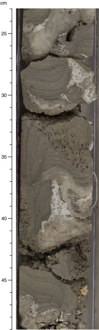 Figure F42. Encrusting and robust branching coral framework locally encrusted with thick coralline algal crusts (Subunit IC; interval 310-M0015A-14R-1, 23–49 cm). Thick laminated microbialite crusts represent last stage of encrustation.