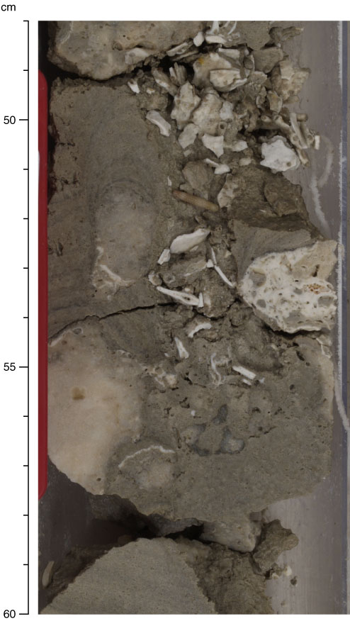 Figure F43. Primary cavity in coralgal-microbialite framework infilled with sediment, including Halimeda segments (Subunit IC; interval 310-M0015A-14R-1, 48–60 cm).