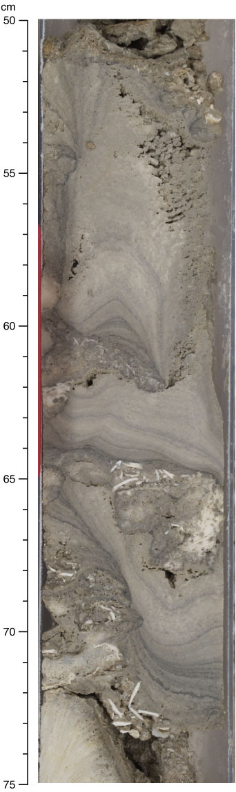 Figure F45. Coralgal-microbialite framework with dominant laminated microbialite (Subunit IC; interval 310-M0015B-26R-1, 50–75 cm). Primary cavities are filled with sediment, including Halimeda.